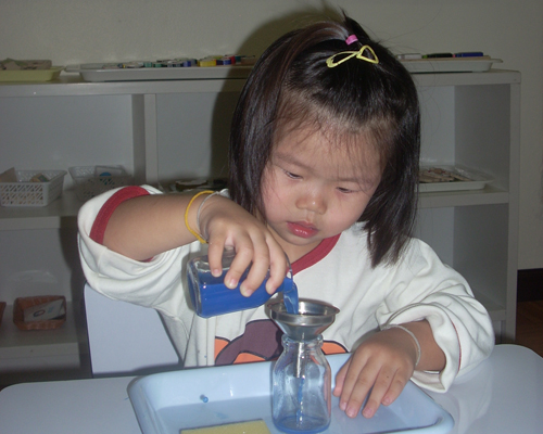 Nutapat learns to pour liquids from little containers that are just right for her small hands. Note the little sponge for wiping up spills. She learns to be careful not to spill a single drop. This exercise helps developing fine motor control and increase her attention span |